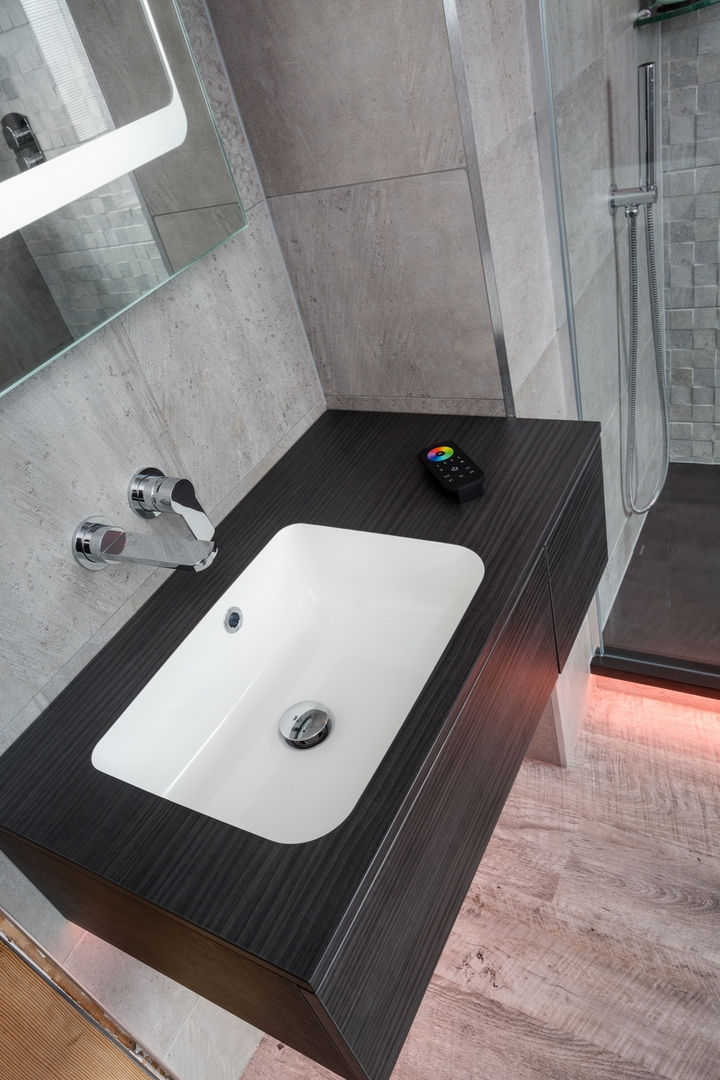 This exquisite bathroom uses a selection of our quality supplied products to create a dramatic feel. The fender and Oakham DQ Heating radiators with one being wall mounted results in a uniformed contemporary look alongside the sleek vanity unit. An interesting point to this room was the use of lighting; there are no spotlights therefore to inject light into this room a large halo mirror and LED strips were utilised behind the shower and along the base of the shower tray. This lighting creates high impact and makes a showpiece of the Porcelanosa Mosaico Rodano Acero tiling on the back wall. To enhance the practicality of the bathroom, integral blinds were installed so that the windows can be easily wiped clean.