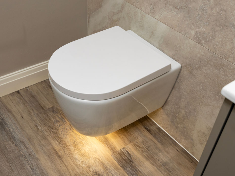 To complete the space, we installed LED spotlights along with a new inline extractor fan to ensure effective ventilation. Feature LED strip lighting was added beneath the WC, vanity unit, and within the shower recess, creating a luxurious atmosphere and elevating the overall design.