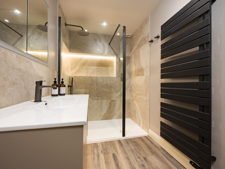 Storage and lighting were carefully considered, with a HIB recessed illuminated LED mirror cabinet providing both practicality and ambient light. Lujo Piedra tiles bring a continental, polished finish to the walls, while Karndean Sicilia Click flooring was laid across the entire room for durability and visual warmth.