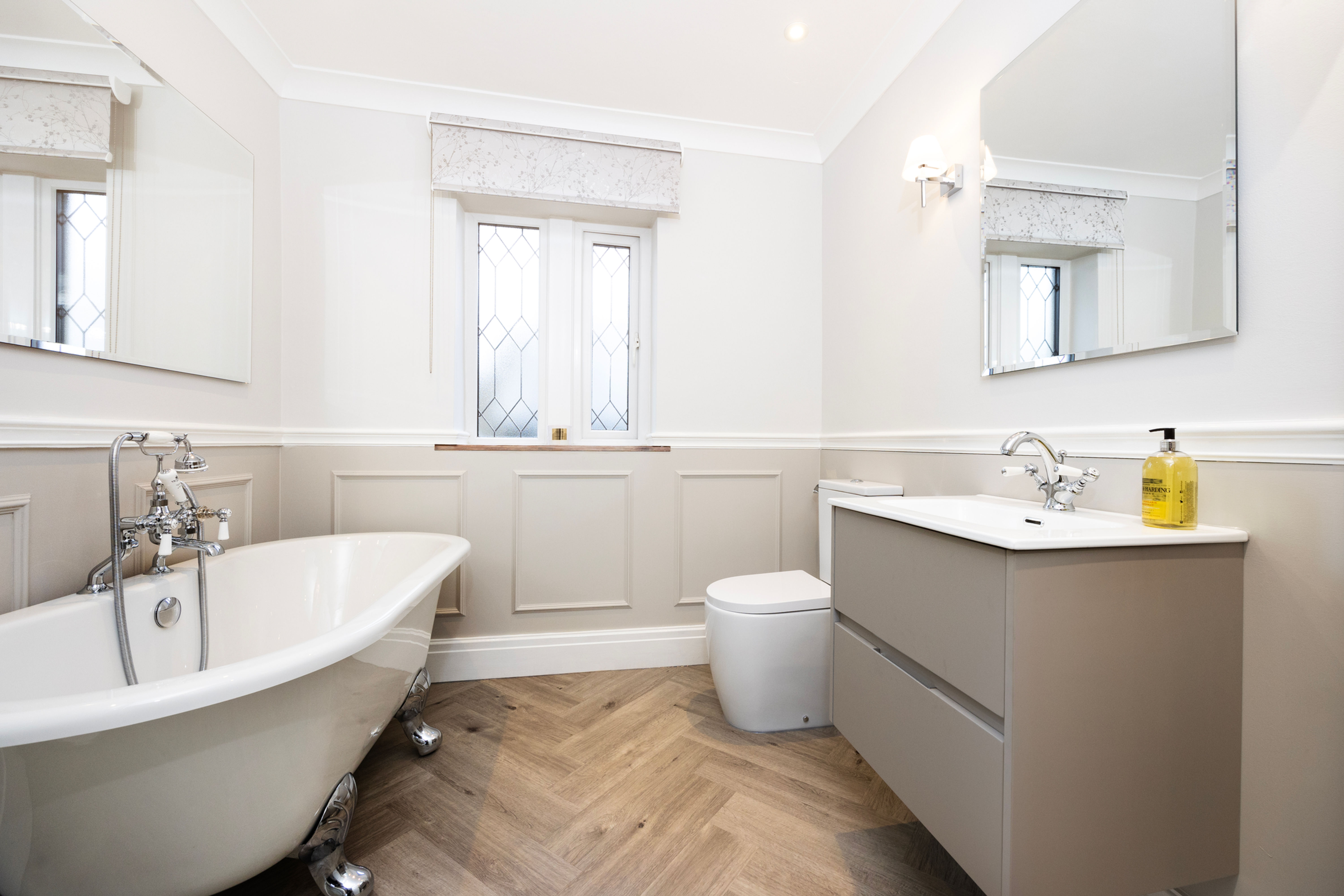 Reflecting timeless sophistication, two bespoke bevelled mirrors hang above the vanity and bath, enhancing the room’s sense of space and light. The Bathrooms to Love Cilantro close-coupled, comfort-height WC offers the comfort and design, with a fully shrouded, rimless bowl and soft-close seat.